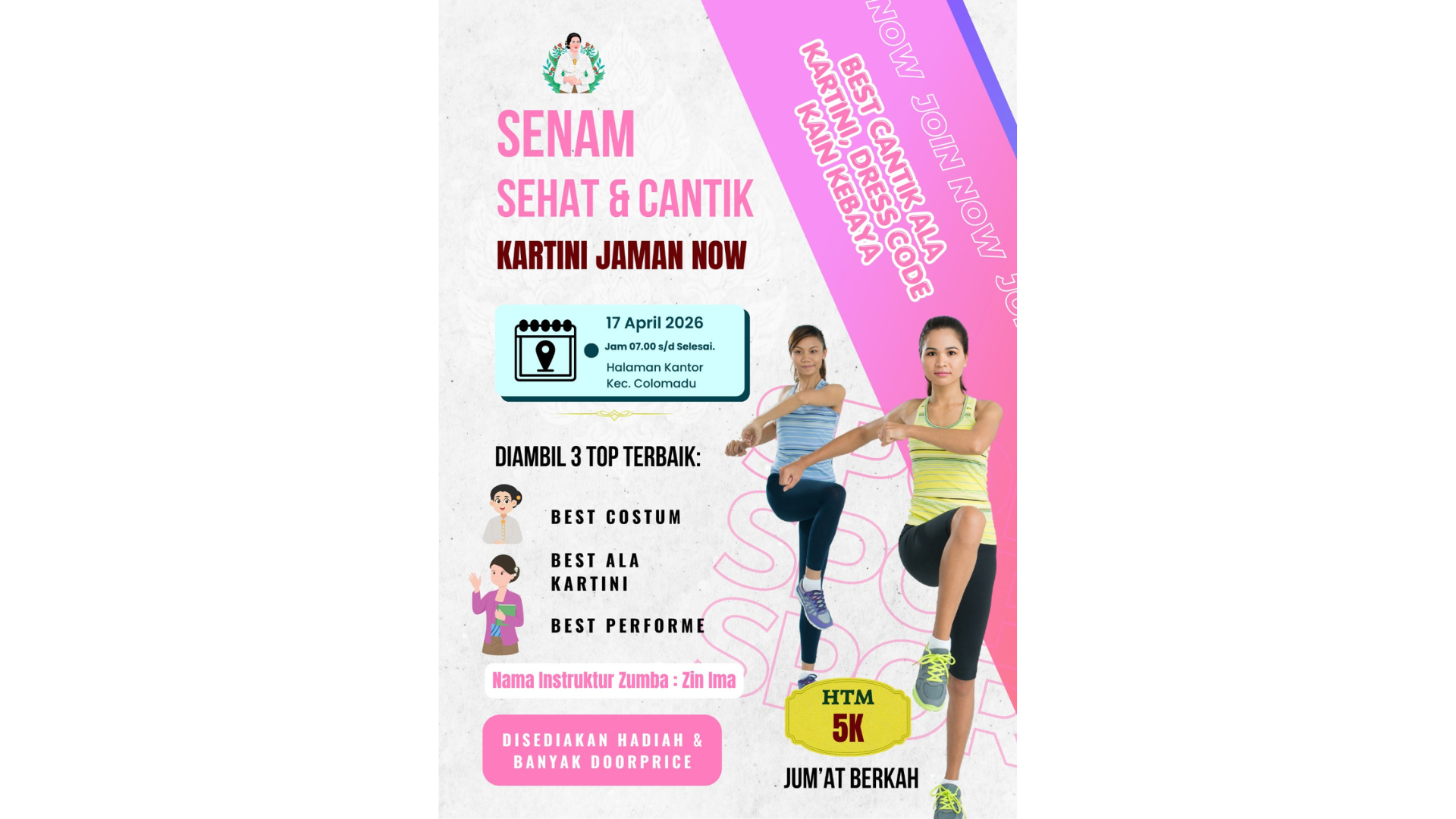“Dalam rangka Hari Kartini 2026, kami mengadakan senam sehat dan cantik Kartini zaman sekarang dengan konsep senam ala zumba. Kegiatan ini terbuka untuk umum dan diharapkan bisa diikuti masyarakat luas,” ujar Sriono.